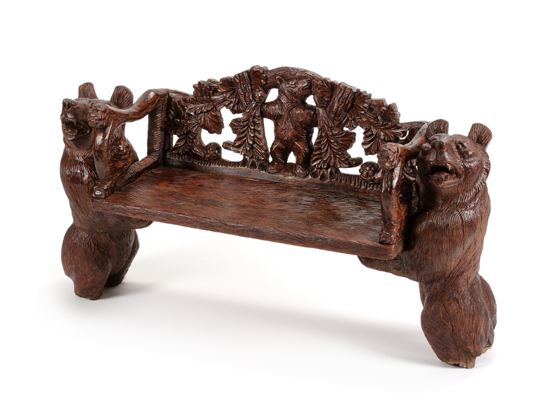 A Black Forest Carved Bench Height 24 x width 45 x depth 15 inches.