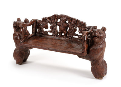 the openwork back carved to show a standing bear among foliage, the plank seat flanked within open arms, raised on bear form supports.
