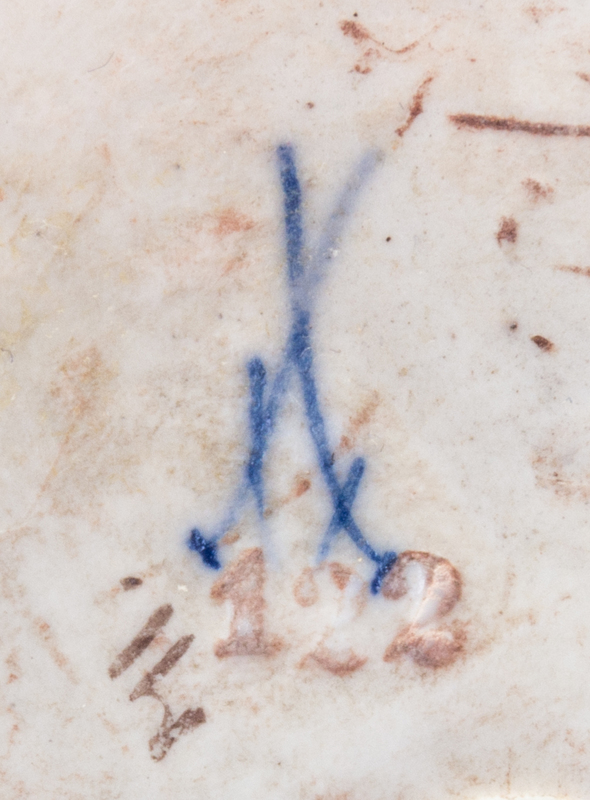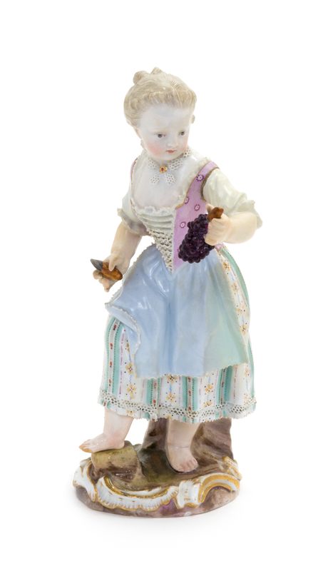 modeled to show a peasant girl holding a bunch of grapes, with crossed swords in underglaze blue to the underside.