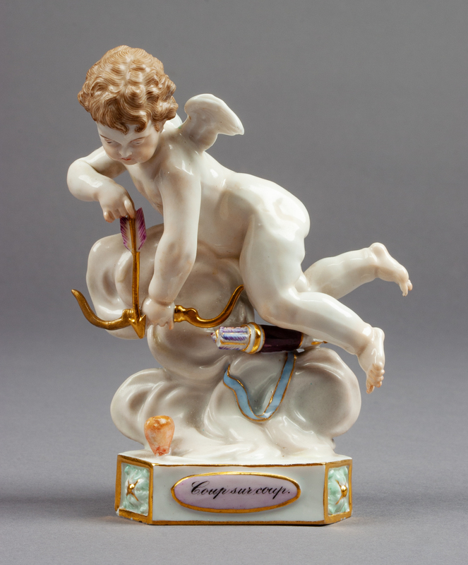 Coup sur coup, modeled to show Cupid shooting an arrow, with crossed swords in underglaze blue to the underside.
