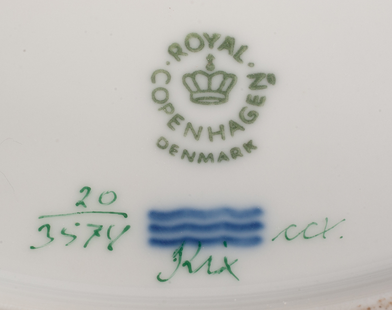 each painted to depict a highly realistic botanical specimen, with blue waves in underglaze blue and painted factory marks to the underside.