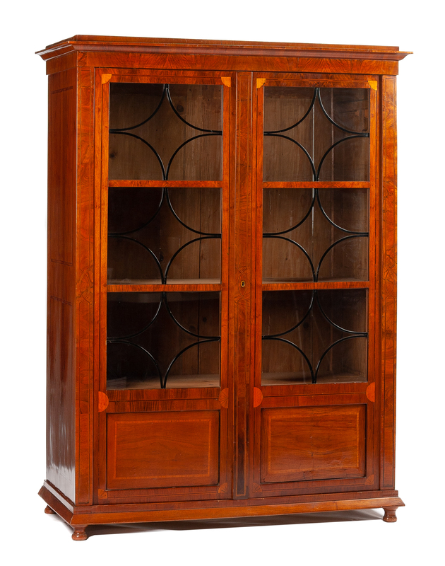 having a molded cornice above the plain frieze and two glazed doors with mullions opening to a shelved interior, raised on bun feet, with inlaid stringing throughout.