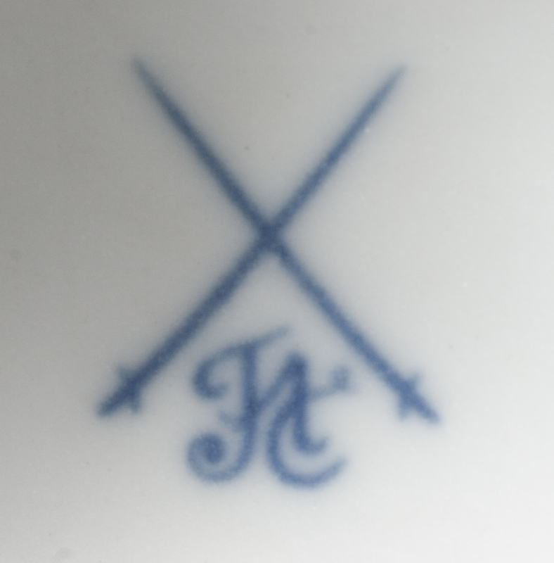 the bowl worked to show foliate scrolls and floral garlands set on a bulbous stem flanked by four putti, raised on shaped feet with putto masks, marked in underglaze blue to the underside.