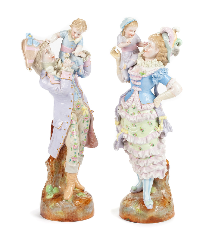 modeled to show a gentleman or a lady holding a child, raised on a naturalistic base.