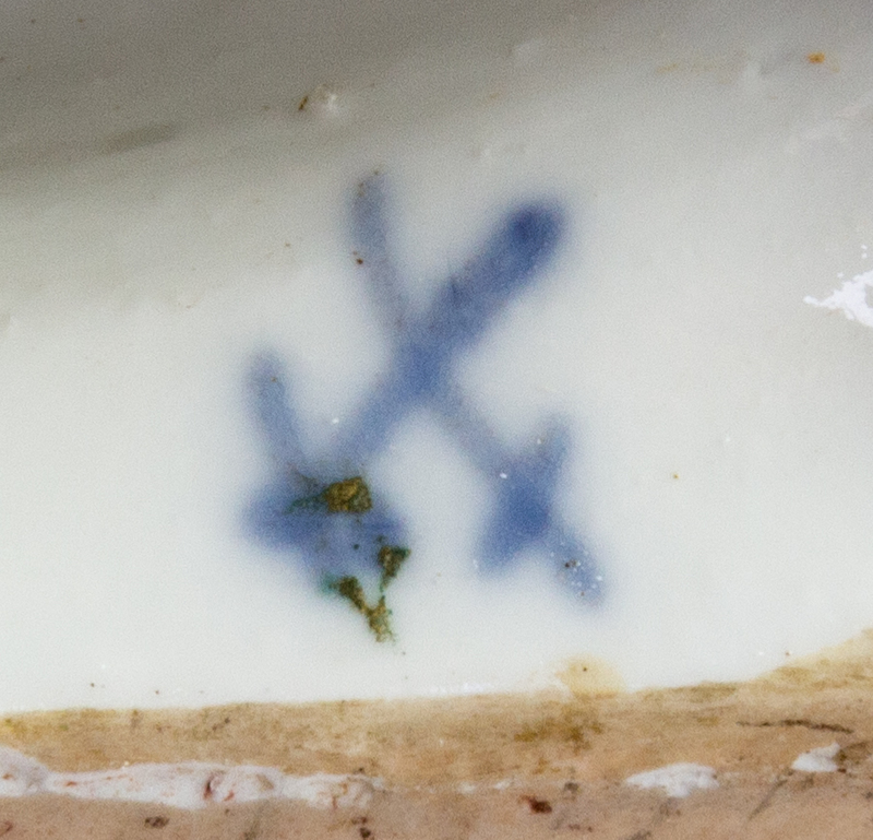 modeled to show two figures among various animals, with crossed swords in underglaze blue to the underside.