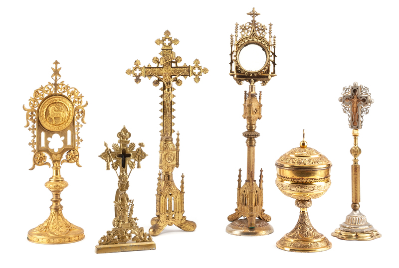 comprising a ciborium engraved In Memory of Peter and Wilhelmina DeMoor to the underside; three reliquaries and two crucifixes.