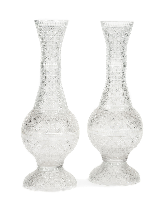 A Pair of Large Cut Glass Vases Height 36 1/4 inches.