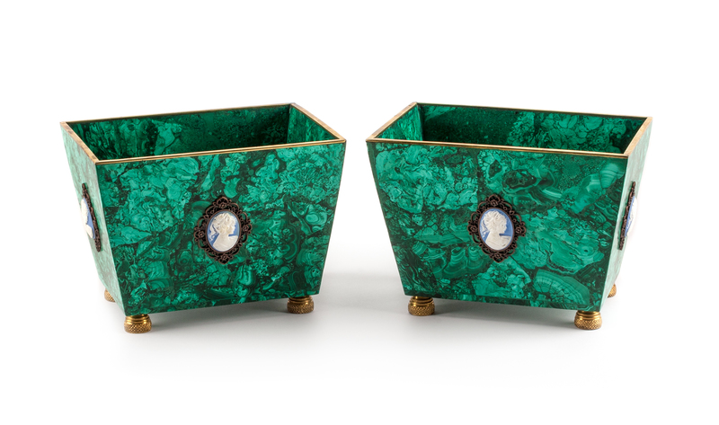 A Pair of Russian Jasperware Mounted Malachite Jardinieres Height 6 3/4 x width 9 1/4 inches.