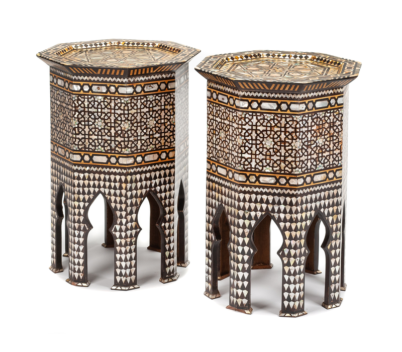 each of octagonal form, set on mihrab form supports with geometric inlays throughout.