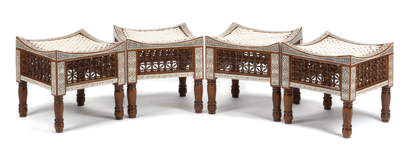 A Set of Four Moorish Style Mother-of-Pearl Inlaid Stools Height 15 inches.