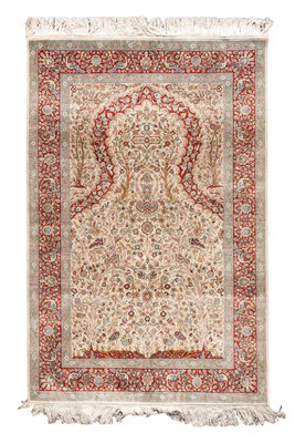 A Sino-Isfahan Silk and Wool Prayer Rug 6 feet 1 inch x 4 feet.