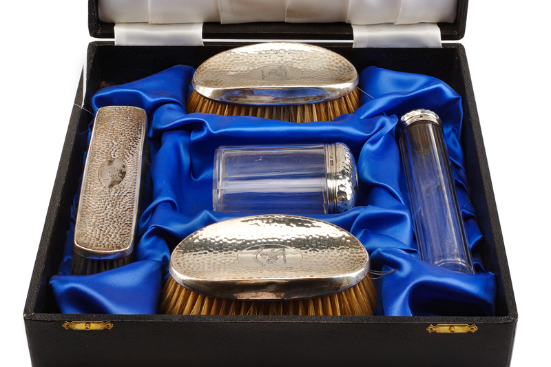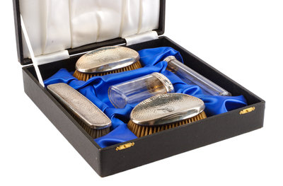 An Edwardian Silver Mounted Five-Piece Dresser Set, H. Matthews, Birmingham, 1902 and Others, comprising three brushes and two silver-m