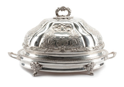 An English Silver-Plate Well-and-Tree Warming Stand with Cover, Late 19th/Early 20th Century, of oval form, the handled stand raised on