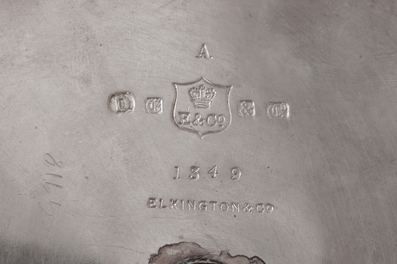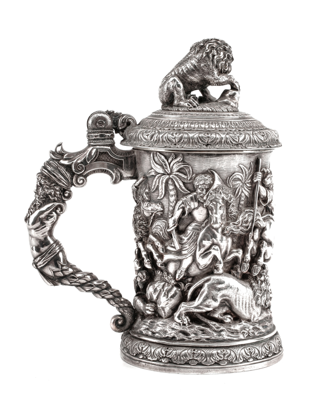 A Victorian Silver-Plate Tankard, Elkington & Co., Birmingham, 1889, the hinged lid with a lion finial above the body worked to show a