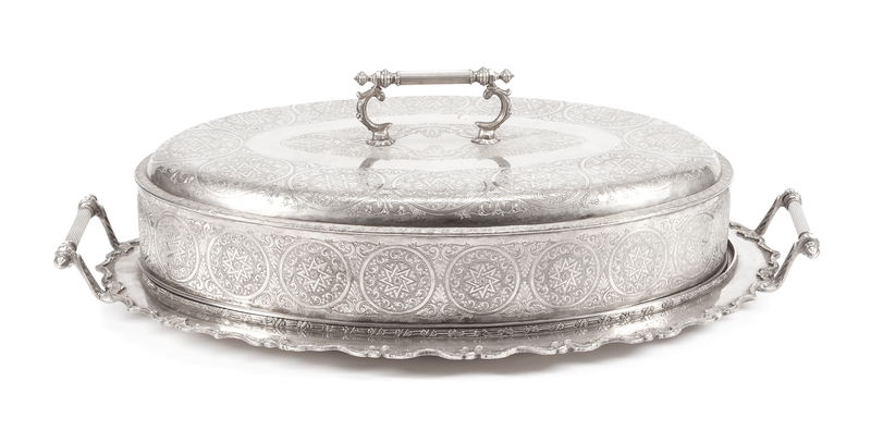 A Silver-Plate Cloche and Tray, Late 19th/Early 20th Century, of oval form, the cloche having a continuous band of circular cartouches