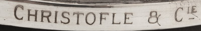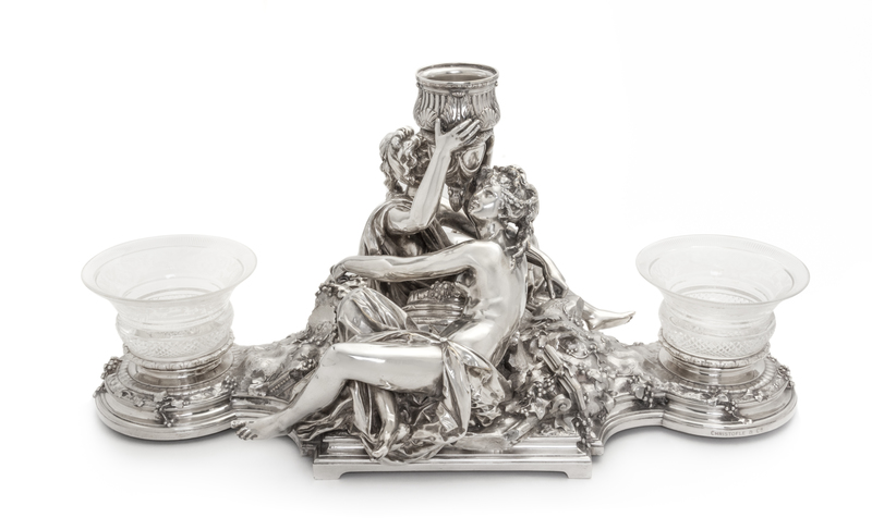 A French Silver-Plate Centerpiece, Christofle, Paris, 20th Century, the central cup supported by two embracing figures sitting on grape