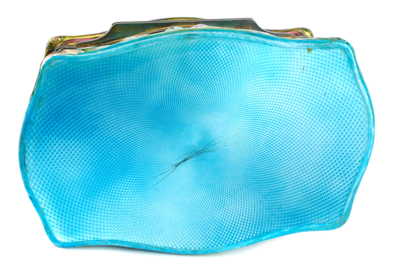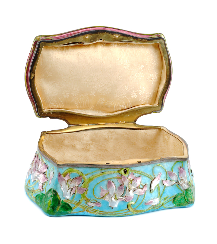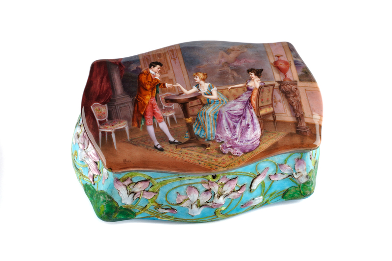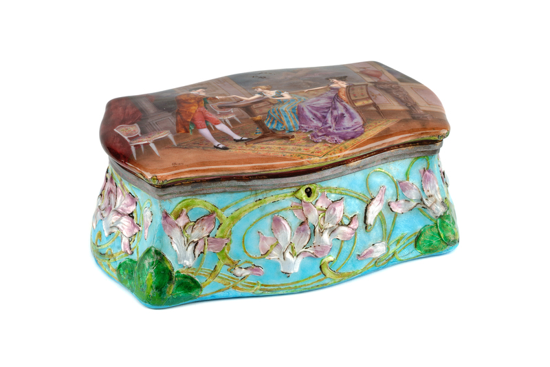An Austrian Enameled Silver Jewelry Box, , of serpentine outline, the hinged top enameled to show a gentleman and two ladies in an inte