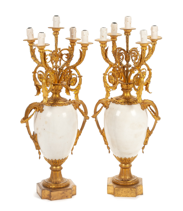 A Pair of Louis XV Style Marble and Gilt Bronze Five-Light Candelabra Height overall 36 inches.