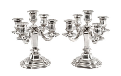A Pair of French Silver Five-Light Candelabra, Tetard Freres, Paris, Early 20th Century, of paneled baluster form and raised on a stepp