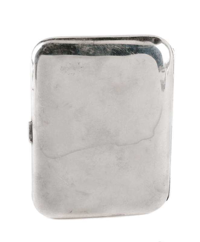An Enameled Silver Cigarette Case, Likely American, Early 20th Century, the lid enameled to show a partially draped nude holding a hand