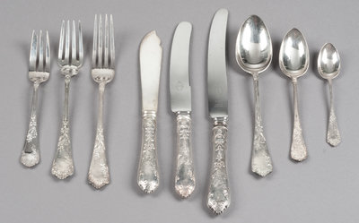 A Russian Silver Flatware Service, Maker's Mark Cyrillic SB, Late 19th/Early 20th Century, comprising: 24 dinner knives 24 luncheon kni