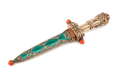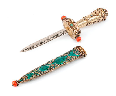 An Eastern European Silvered, Jeweled and Enameled Dagger Length 8 3/4 inches.