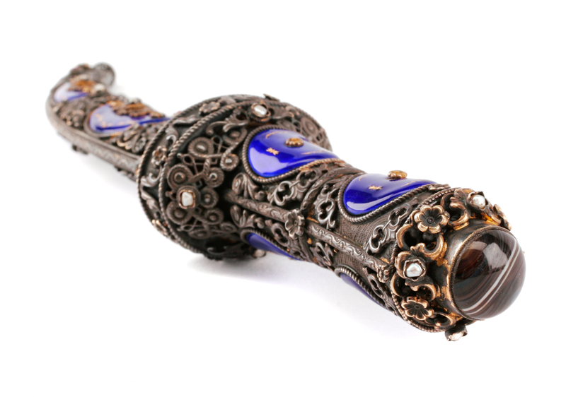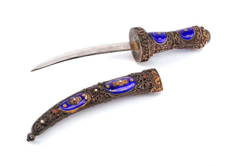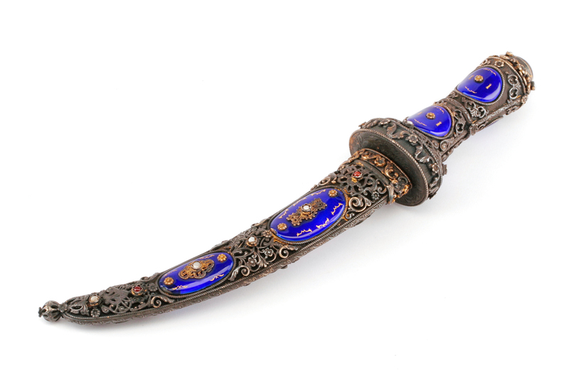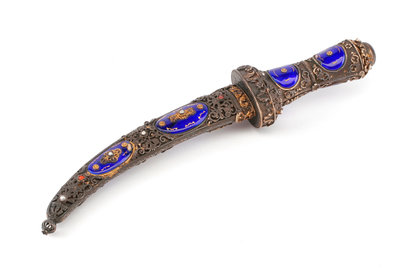 An Eastern European Silvered, Jeweled and Enameled Dagger Length 11 1/2 inches.