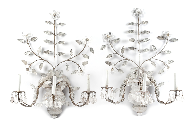 A Pair of Silvered Metal and Rock Crystal Three-Light Sconces Height 30 inches.