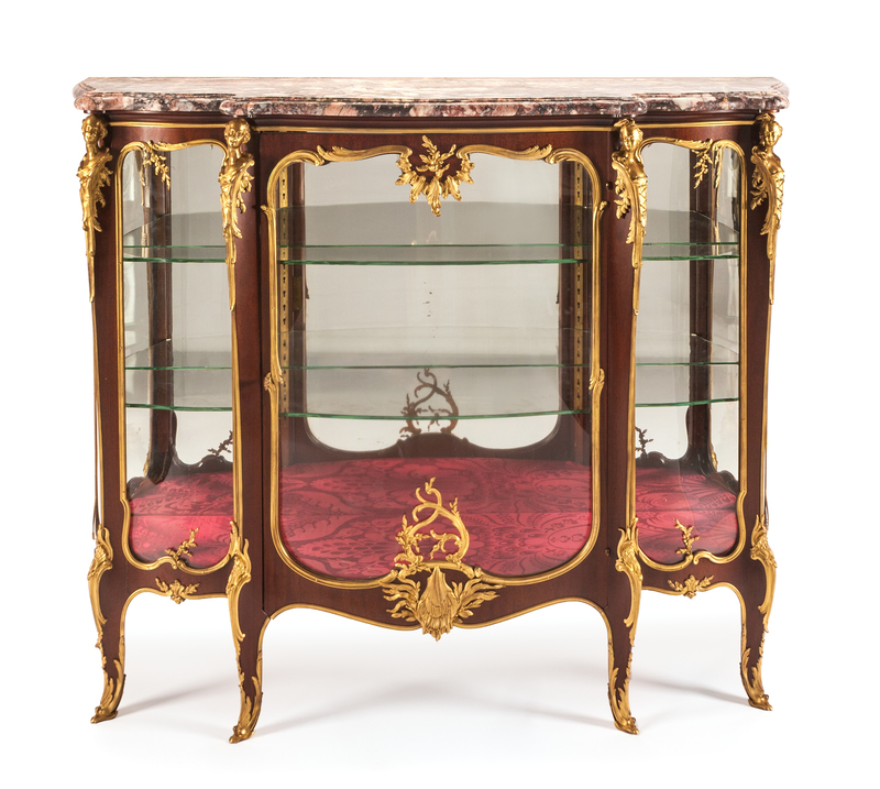 A Louis XV Style Gilt Bronze Mounted Mahogany Vitrine Cabinet Height 48 x width 55 x depth 19 inches.