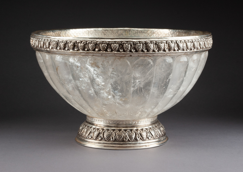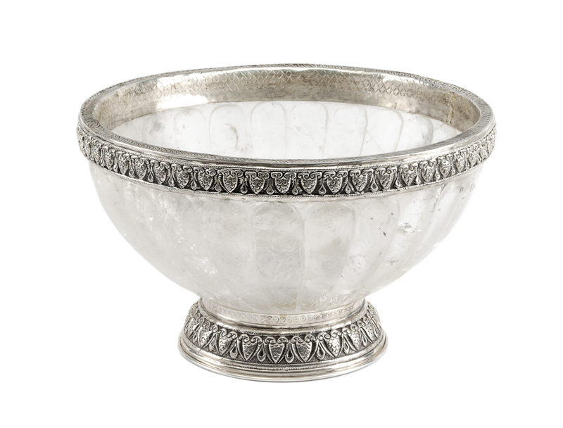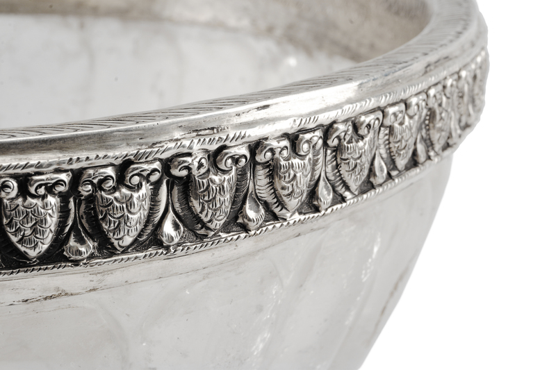 the rock crystal body of lobed form, the silver mounts stamped .925.