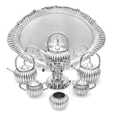 A Mexican Silver Seven-Piece Tea and Coffee Service, Kimberley, Mexico City, 20th Century, Kimberly pattern, comprising a water kettle-