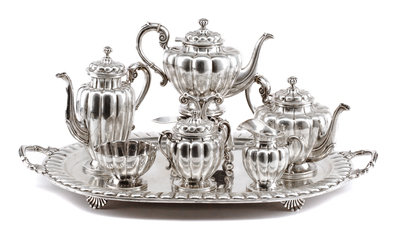 A Mexican Silver Seven-Piece Tea and Coffee Service, Sanborns, Mexico City, 20th Century, comprising a water kettle-on-stand, coffee po