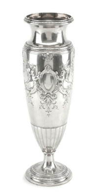 An American Silver Vase, International Silver Co., Meriden, CT, of elongated baluster form, the body worked to show two vacant cartouch