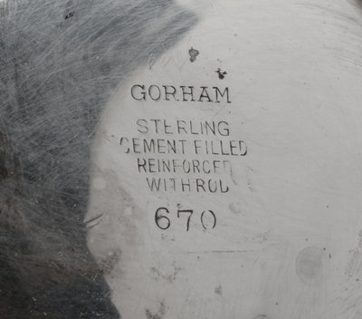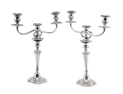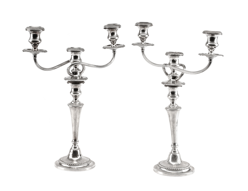 A Pair of American Silver Three-Light Candelabra, Gorham Mfg. Co., Providence, RI, each having three candle cups and a knopped stem wit