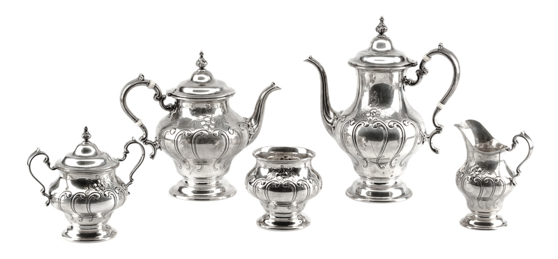 An American Silver Five-Piece Tea and Coffee Service, Gorham Mfg. Co., Providence, RI, Chantilly-Countess pattern, comprising a teapot,