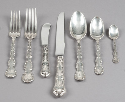 An American Silver Flatware Service, Gorham Mfg. Co., Providence, RI, Strasbourg pattern, each with a script R monogram, comprising: 12