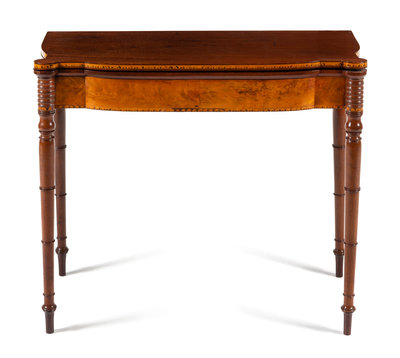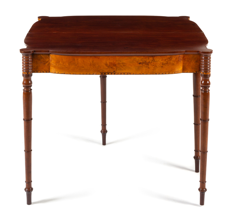 An American Mahogany, Burlwood and Pine Card Table Height 29 1/2 x width 35 1/8 x depth 17 1/4 inches (closed).
