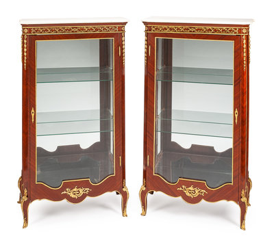 A Pair of Louis XV Style Vitrine Cabinets Height 59 3/4 x width 34 x depth 18 inches.