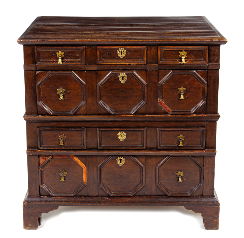 A Charles II Oak Chest of Drawers Height 38 1/4 x width 38 x depth 23 inches.