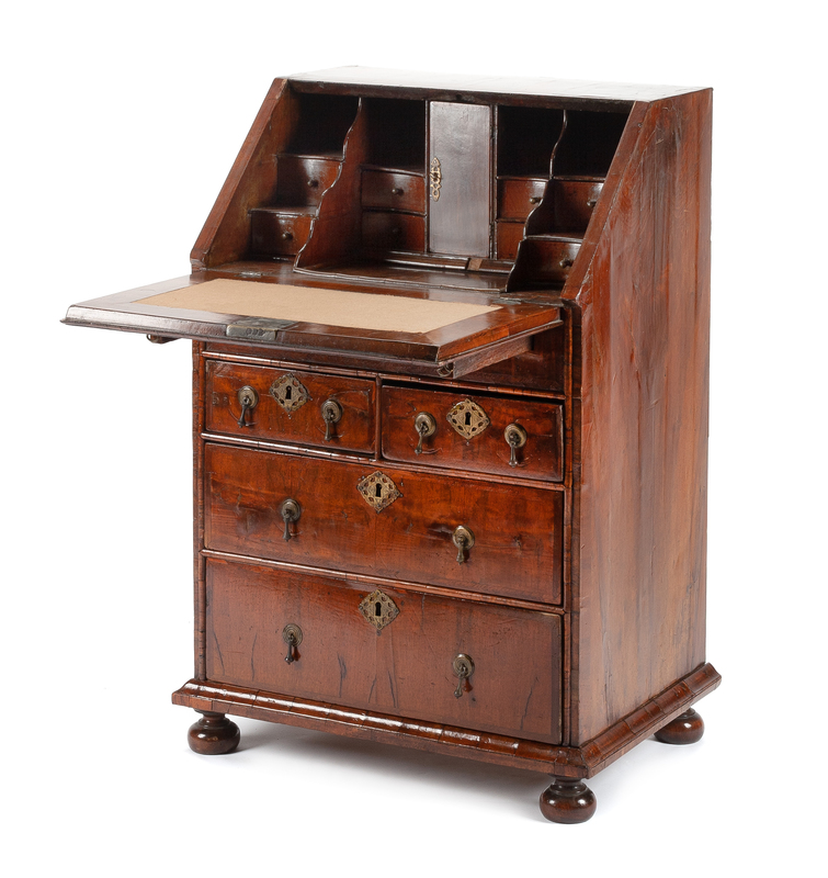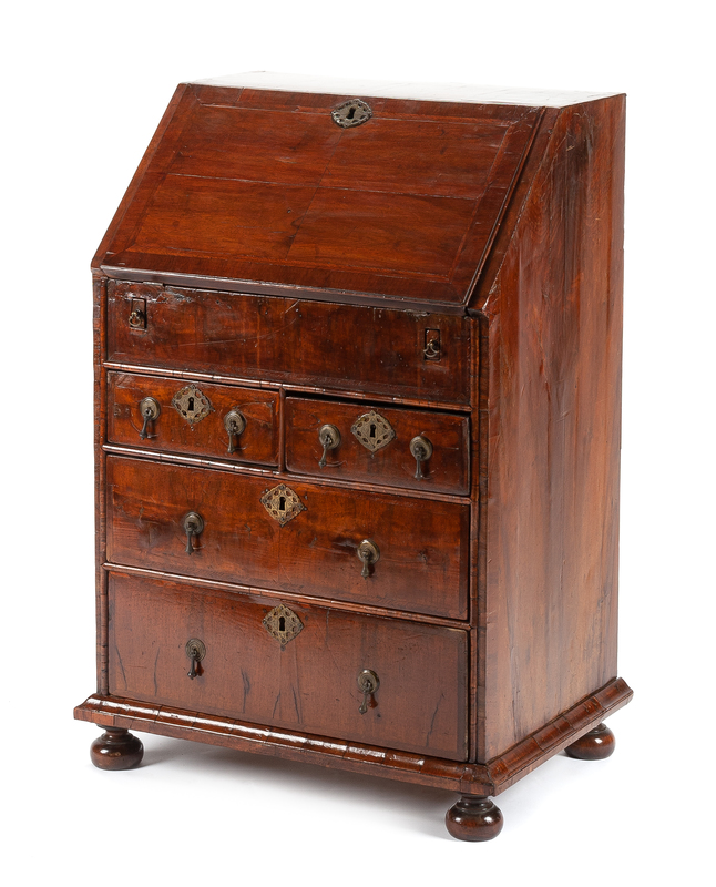 A Queen Anne Walnut Diminutive Slant-Front Desk Height 37 1/2 x width 26 x depth 18 1/4 inches.