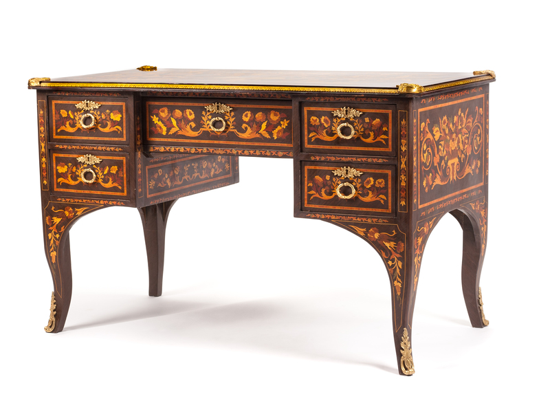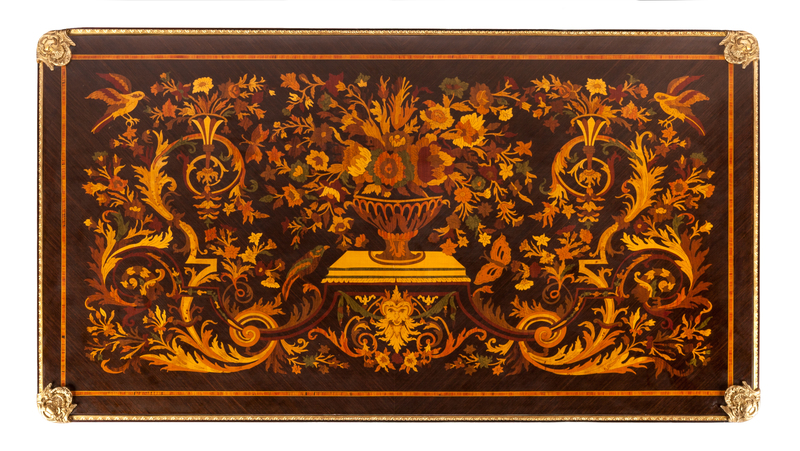 A Louis XV Style Marquetry and Gilt Bronze Mounted Bureau Plat Height 31 1/2 x width 51 x depth 28 inches.