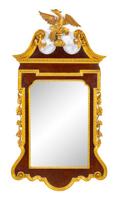 the swan neck crest centered with a phoenix above the beveled vertical rectangular mirror plate flanked by foliate garlands.