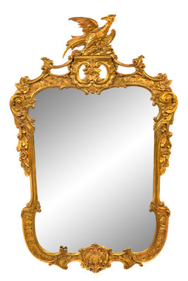 the openwork crest centered with a phoenix perched atop rockery above the frame carved to show C-scrolls, foliate scrolls and rocaille, enclosing the conforming vertical rectangular mirror plate.