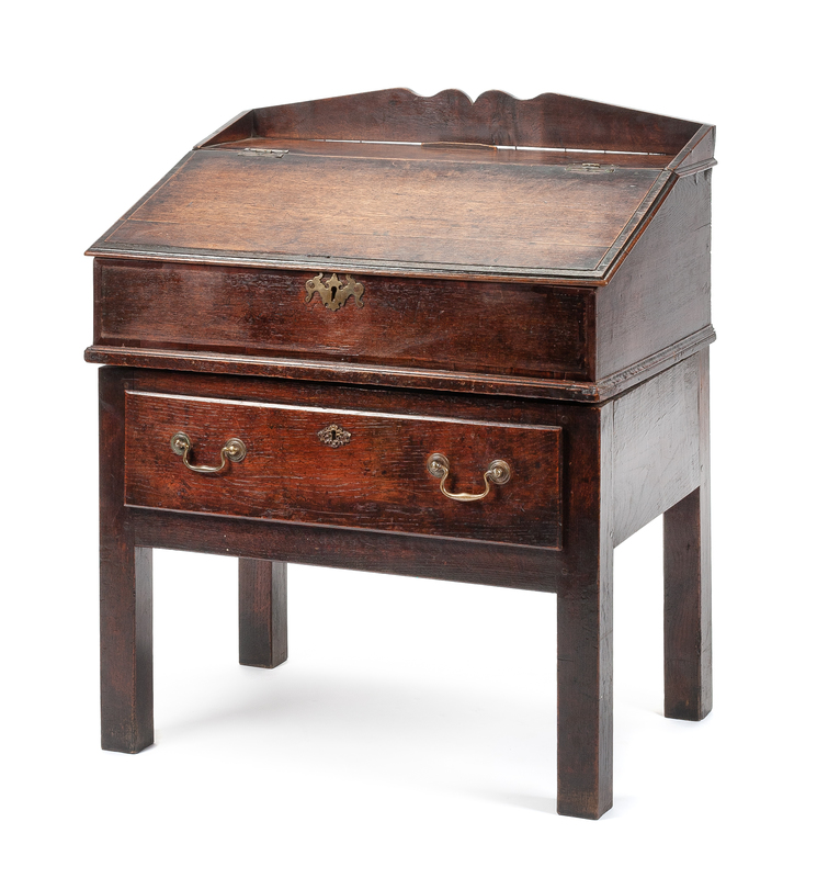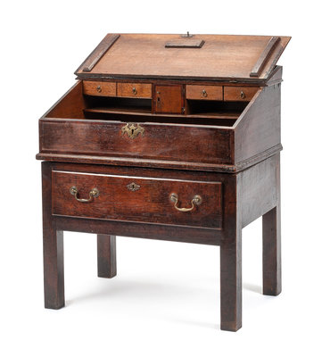 A George III Oak Lift-Top Desk Height 37 x width 31 x depth 21 inches.