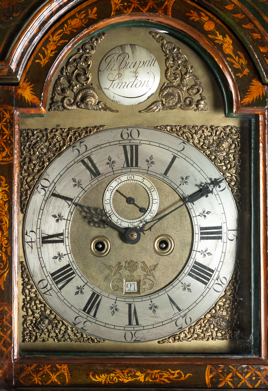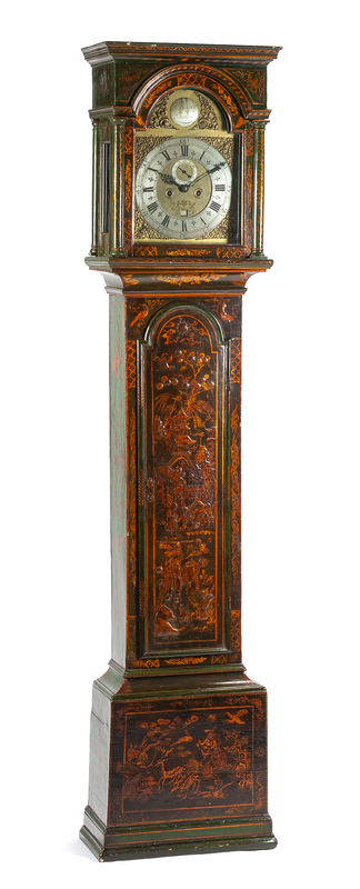 the hood having a molded cornice above the glazed door opening to the silvered chapter ring having Roman numeral hours and Arabic numeral minutes, further set with a seconds dial and date aperture, signed Jn. Burputt/ London, the straight trunk fitted with a door and raised on a molded plinth base, with lacquered Chinoiserie decoration throughout.