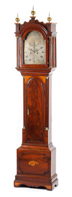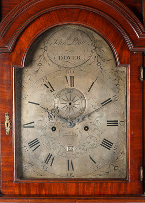 the domed cornice with ball finials, the glazed door opening to the steel dial with Roman numeral hours and Arabic numeral minutes, further set with a seconds dial and date aperture, signed John Pratt/ Dover, the straight trunk fitted with a door and inlaid to show paterae and a shell, raised on bracket feet.