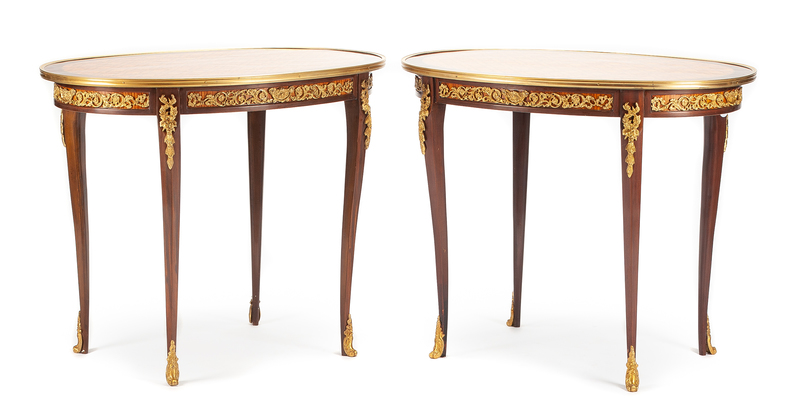 each having an oval marble top above the conforming frieze, raised on cabriole legs ending in sabots.