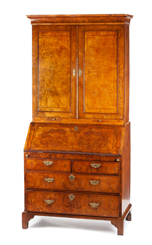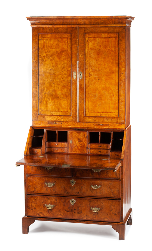 in two parts, the superstructure having a molded cavetto cornice above two paneled doors, the base fitted with a slant-front opening to a fitted interior over two short drawers and two graduated long drawers, raised on bracket feet.