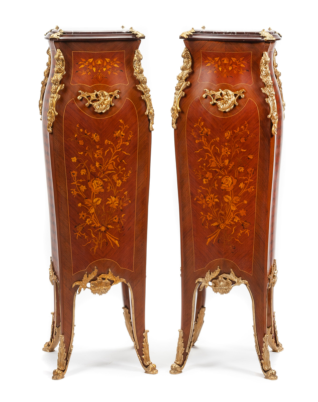 A Pair of Louis XV Style Gilt Bronze Mounted Marquetry Pedestals Height 48 x width 15 x depth 15 inches.