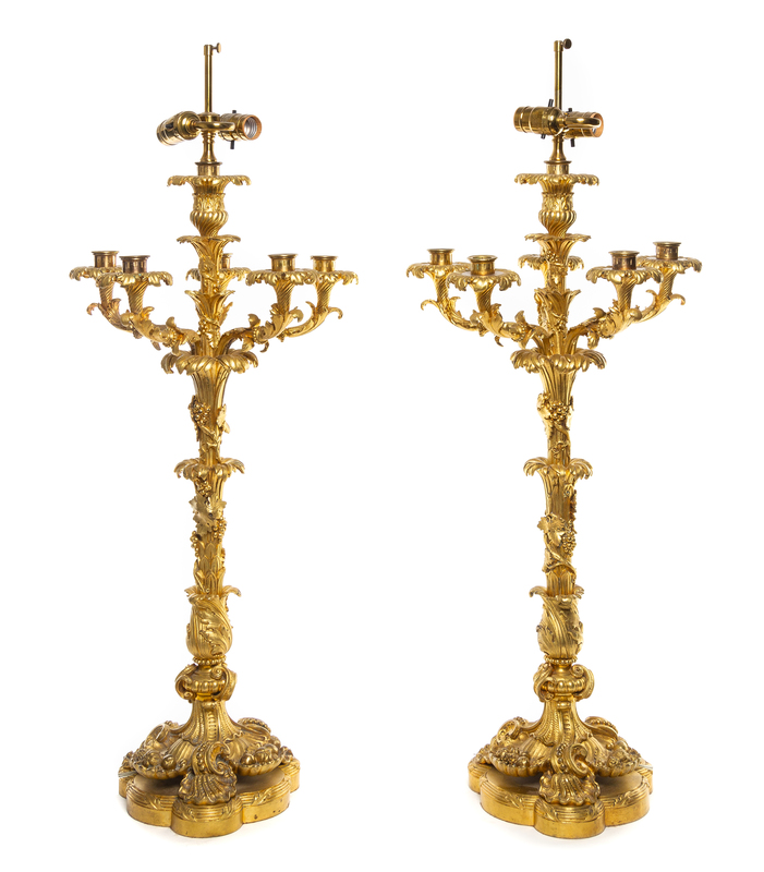 each foliate stem entwined with grapevines and issuing the central candle arm and five scrolling candle arms, the shaped base cast to show rocaille and various fruits, mounted as lamps.